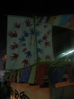 2009年10月11日 滑石祭り 今年は10年目の節目で、10年前の滑石中学校の美術部が作成したバックパネルが現在の美術部作成のパネルと交代するということで セレモニーもありました。 こういった伝統が次世代へ繋がって行くという事が本当にすばらしいな と、この仕事をしていていつも思います。 当時作成に携わったOB・OGも参加してのセレモニーだったので実に美しかったです。(涙) ステージも地元の子供たちのパワーに圧倒されっぱなしでした。 この地区は実行委員会と中学校、小学校の校長先生のコミュニケーションが非常にとれていて、地域での子供育成が非常に優れいている町なので 色々な面で毎年勉強させていただいています。